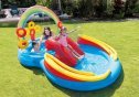 Zábavné vodní nafukovací hrací centrum se skluzavkou, dvěma bazénky, sprchou a dalším příslušenstvím s motivem duhy potěší každé dítě od 2 let. Součástí hracího centra RAINBOW RING je skluzavka s měkkým dojezdem, nafukovací oblouk se sprchou, 4 nafukovací kroužky, 6 míčků a kolejnice na jejich kutálení a také sada na případné opravy. Hrací centrum má vypouštěcí ventil a možnost připojení na zahradní hadici. Multifunkční hrací bazének vaše děti zabaví v horkých letních dnech. Podívejte se také na naši nabídku hraček do vody a zpestřete vašim dětem letní koupání.