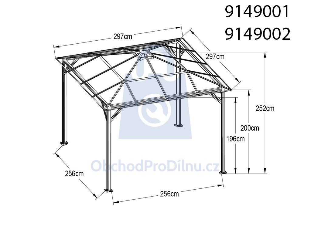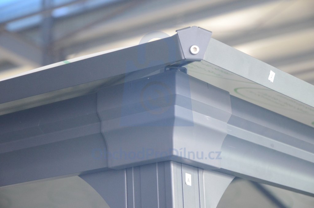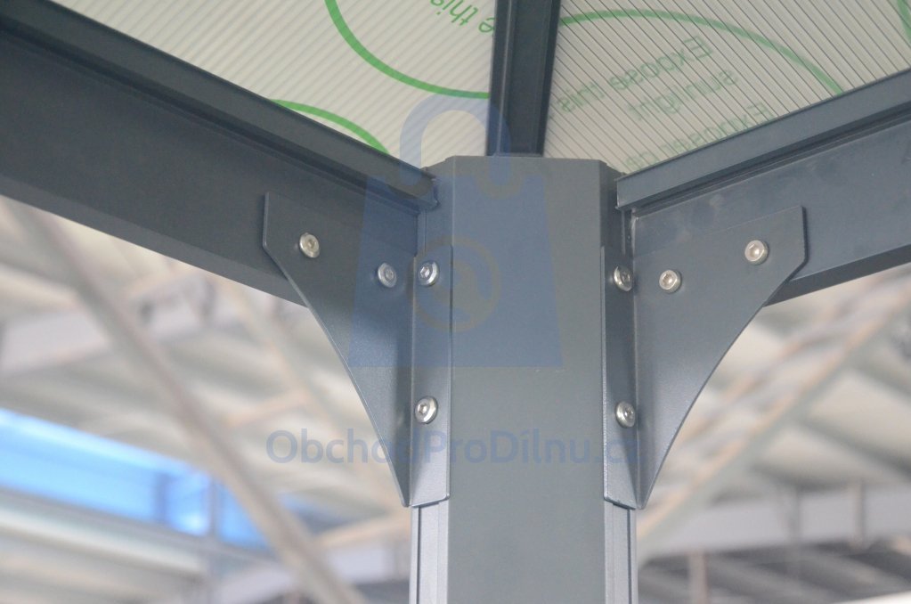 Zahradní hliníkový altán LANITPLAST 33 poskytuje potřebný stín pro posezení na zahradě. Nejedná se o běžný lehký altán s trubkovou skládací konstrukcí (jako je běžně ke koupi v hobbymarketech), ale o masivní výrobek zhotovený ze silných vzájemně sešroubovaných hliníkových profilů (síla 10 mm) určený k pevné montáži k zemi pomocí patek. Hliníkové profily jsou ochráněny práškovou vypalovací barvou v tmavě šedém odstínu - antracit. Spojky jednotlivých profilů jsou vyrobené z lakovaného pozinkovaného ocelového plechu 1,5 mm. Z důvodu zajištění maximální kvality je výhradně použit kvalitní polykarbonát MARLON (výrobce Brett Martin Velká Británie), který v ČR prošel náročnými testy ve státem akreditovaných zkušebnách jako stavební materiál. Smluvní prodloužená záruka 10 let na nerozbitnost polykarbonátu krupobitím je u produktů od LANIT PLASTU samozřejmostí. Střecha tohoto modelu altánu je vyrobena z komůrkového polykarbonátu 6 mm.