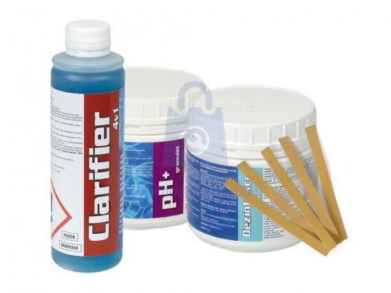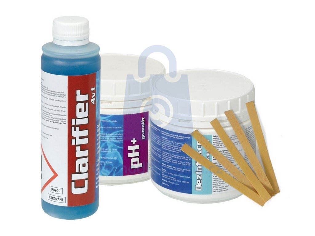 - pH- (obsah 0,5 kg, kontrolovat 2x týdně) - voda ke koupání má mít hodnotu pH v rozmezí 6,5 - 7,4