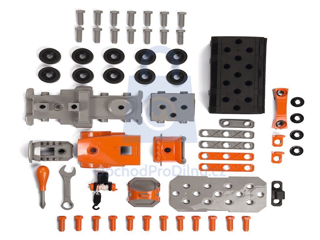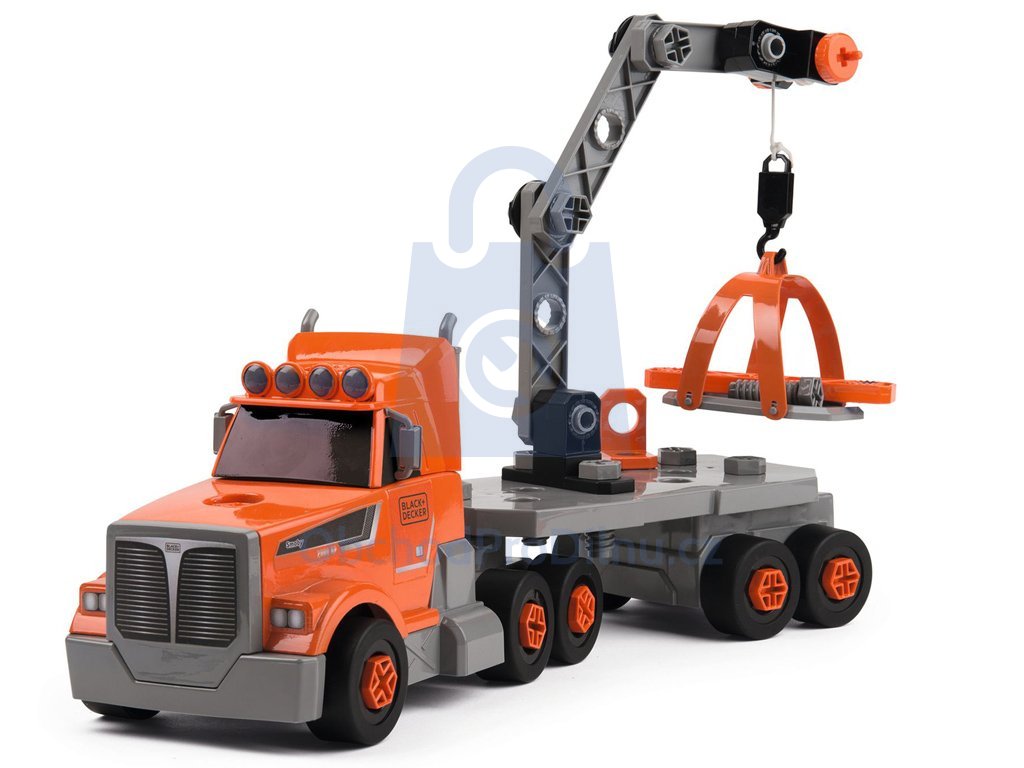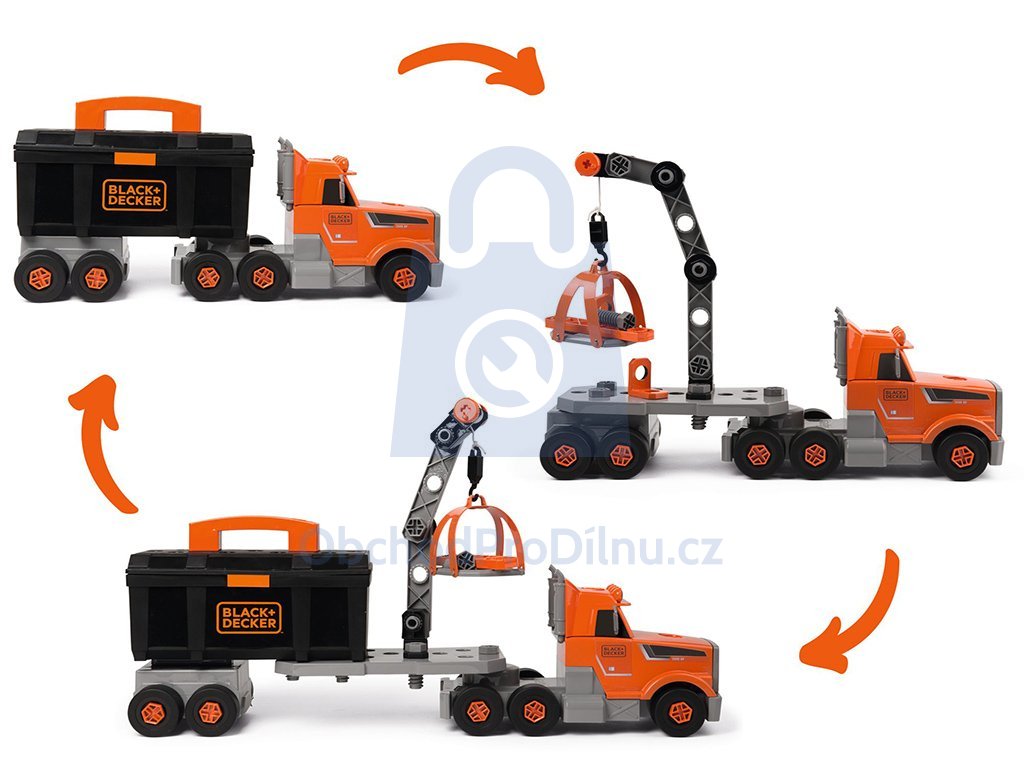 Black & Decker kamion s dětským nářadím je variabilní stavebnice kamionu s jeřábem. Kamion lze přestavět na různé konstrukce o délce 43 až 65 cm. Kamion si jako přívěs veze box s nářadím, který obsahuje: šroubovák, klíč a spoustu šroubků, matic a dalších konstrukčních dílů. Vaše dítě si tak bude moci sestavit náklaďák přesně podle své fantazie z cca 60 dílů, které najde v kufříku. Stavebnice je vhodná pro malé kutily do 3 let. Doplňte vaší ratolesti dětskou dílnu, která pomáhá rozvíjet kreativitu a zručnost.