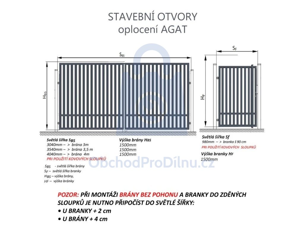 | provedení, specifické vlastnosti | dvoukřídlá kovová brána AGAT s jednoduchými liniemi a vertikální výplní 50×10 mm, vhodná k moderní i klasické architektuře |
