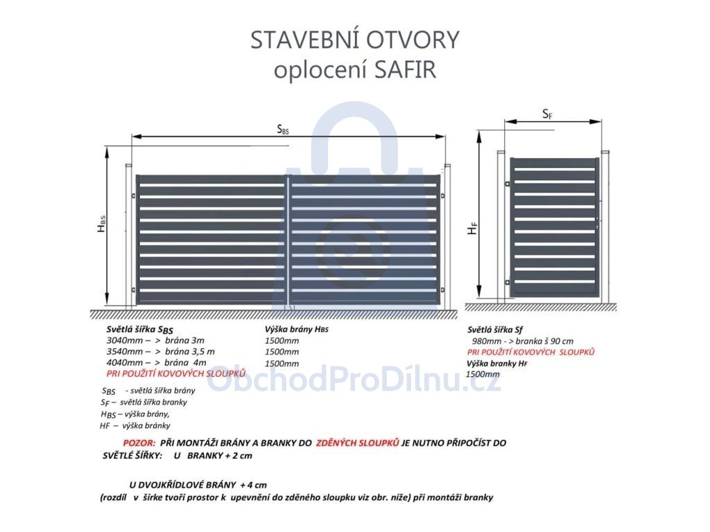 | provedení, specifické vlastnosti | jednokřídlá kovová branka SAFIR v moderním stylu, univerzální pro levé i pravé otevírání |