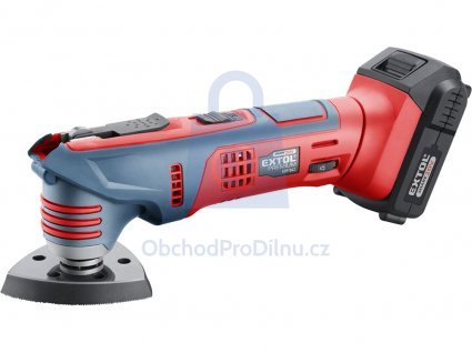 Aku multifunkční bruska je vhodná k řezání a oddělování dřeva, dřevěných materiálů, umělé hmoty, sádrokartonu i měkkých kovů - mědi, hliníku, nekalených hřebíků, slitin měkkých kovů). Aku multifunkční brusku využijete také k rašplování, broušení a seškrabávání menších ploch. Bruska umožňuje provádět přesné práce na těžko přístupných místech, např. provádění výřezů v rozích nábytku, obkladaček atd. Nespornou výhodou je akumulátorový pohon, který umožňuje si vzít brusku s sebou všude bez ohledu na to, jestli tam je rozvod elektrické energie. Akumulátor lze použít ve všech typech nářadí řady EXTOL SHARE20V. Stroje lze zakoupit v sadě s akumulátorem nebo samostatně. Díky použité Li-ion technologii je možné akumulátor kdykoliv dobíjet, aniž by se tím snižovala jeho kapacita. Li-ion akumulátor ztrácí energii vlivem samovybíjení velmi pomalu a vydrží dlouho nabitý a připravený k použití.