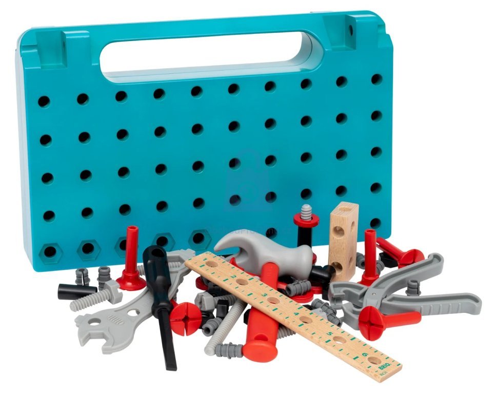 Výrobce: Brio. Praktický pracovní stůl s nářadím, který se mění v kufřík – ideální sada pro malé kutily a stavitele od 3 let.