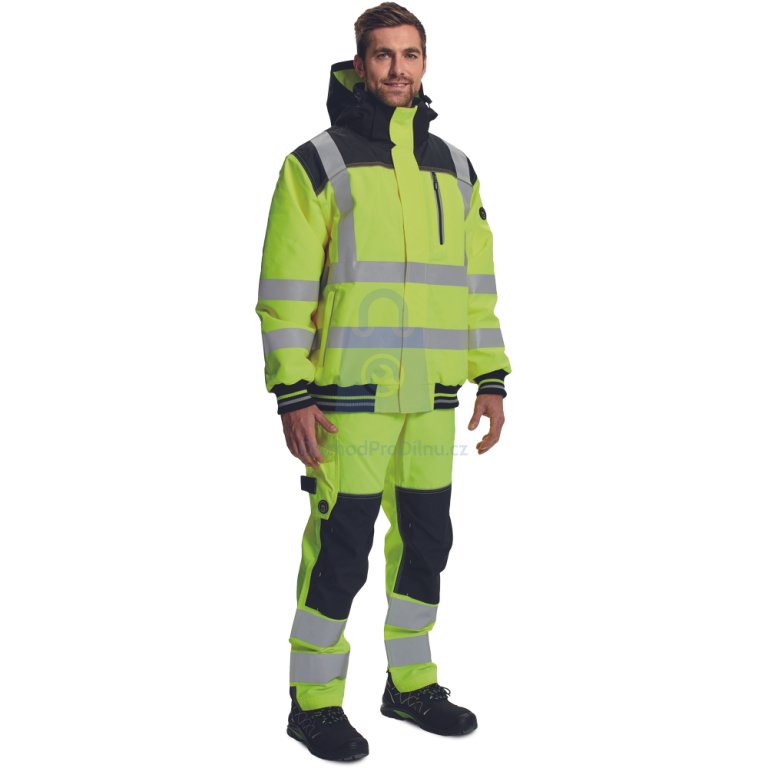 Vnitřní komfort zajišťuje podšívka z taffety (gramáž 55 g/m²) a zateplení 180 g/m². Ramena jsou zesílena materiálem Oxford 600D pro delší životnost. Bunda má odepínací kapuci, 1 náprsní kapsu na zip, 2 boční kapsy a 2 vnitřní uzavíratelné kapsy. Výrazné reflexní pruhy o šířce 5 cm spolu s reflexními paspulkami zajišťují maximální viditelnost dle normy EN ISO 20471 (třída 3).