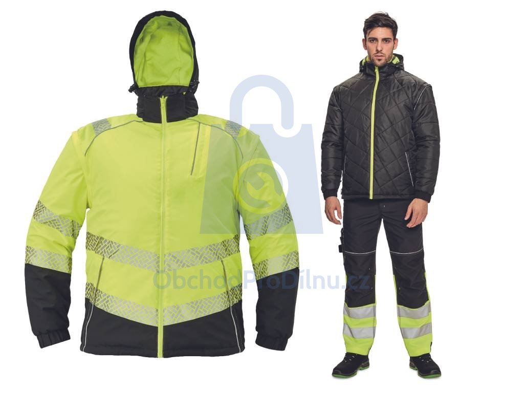 Bunda je oboustranná – z vnější HI-VIS strany nabízí plnou viditelnost, z vnitřní strany v černém provedení s reflexními paspulkami elegantní vzhled pro méně náročné situace. Zapínání na zip krytý légou, 2 postranní kapsy na zip a 1 náprsní kapsa na zip poskytují praktické úložné prostory.