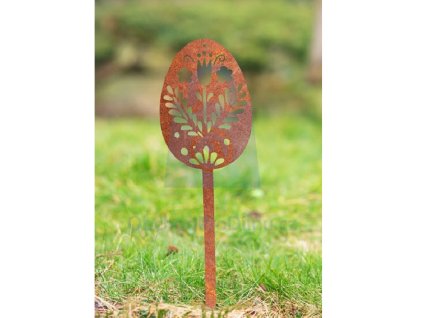 Zapichovací trn umožňuje snadné a pevné umístění do hlíny – bez nutnosti dalšího upevnění. Díky povrchové patině, která vzniká přirozenou oxidací, získává kraslice přírodní, zemitý tón, který krásně ladí s ostatní zelení i dřevěnými prvky, a navíc je materiál chráněn před další korozí zcela bez údržby.