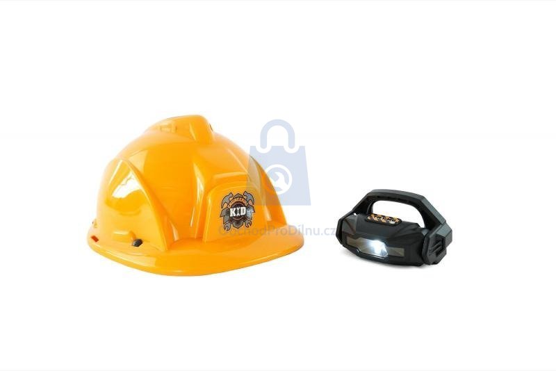 Výrobce: Plejo. Dětská pracovní helma s čelovkou pro malé stavitele a kutily.