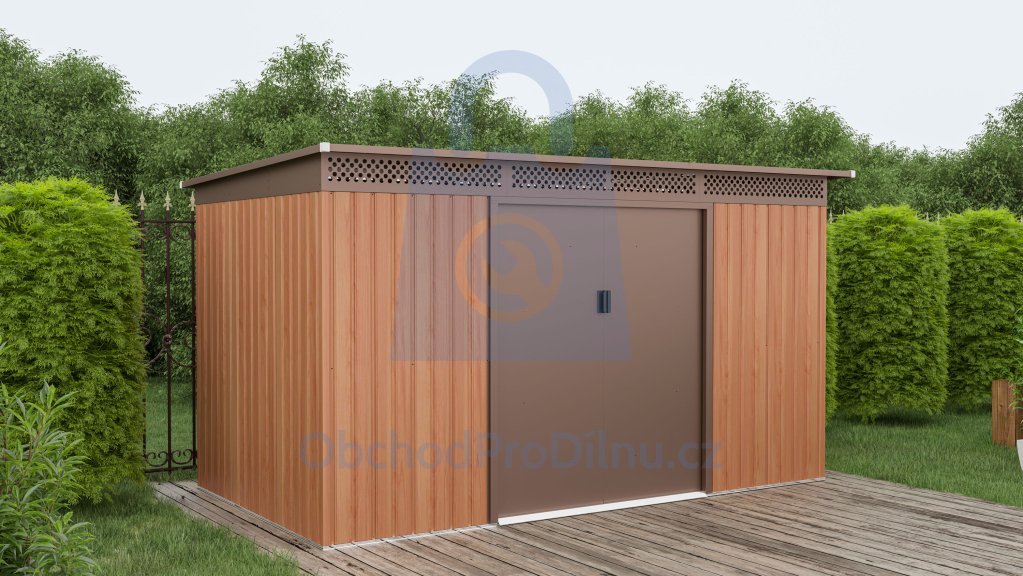 Plechový zahradní domek GRAH je vyroben z kvalitního profilovaného ocelového plechu, který je z vnitřní i vnější strany chráněn pozinkováním a práškovým nástřikem v hnědé či antracitové barvě. Domek je opatřen dvoukřídlými posuvnými dveřmi, které zaručují pohodlný vstup za každých okolností. Madlo pro snadné otevírání je samozřejmostí, najdete zde i přípravu pro zavěšení visacího zámku. Veškeré zahradní nářadí a zahradní technika tak mohou být v domku umístěny bez obav z jejich odcizení.
