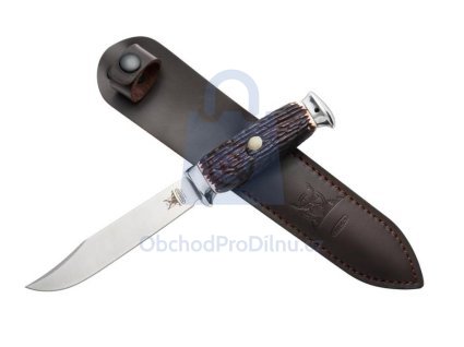 Výrobce: Mikov Mikulášovice. Tradiční lovecká dýka s čepelí z nerezové oceli, rukojetí v imitaci parohu a koženým pouzdrem – spolehlivý společník pro lov i pobyt v přírodě.