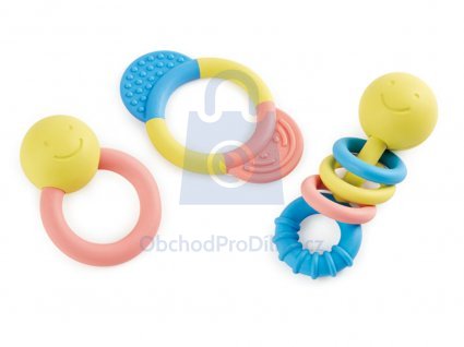sada obsahuje: kousátko kroužek, chrastítko prstýnek, kousátko s kroužky