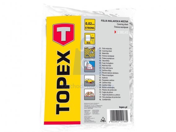 Zakrývací fólie od výrobce TOPEX je vyrobena z plastu (LDPE) o tloušťce 0,02 či 0,007 mm. Fólie má rozměry 4 x 5 metrů a využití nalezne při ochraně nábytku či podlah při malování, rekonstrukcích, skladování apod., jako ochrana před znečištěním a vlhkostí. Zakrývací fólii dodáváme po jednotlivých kusech.