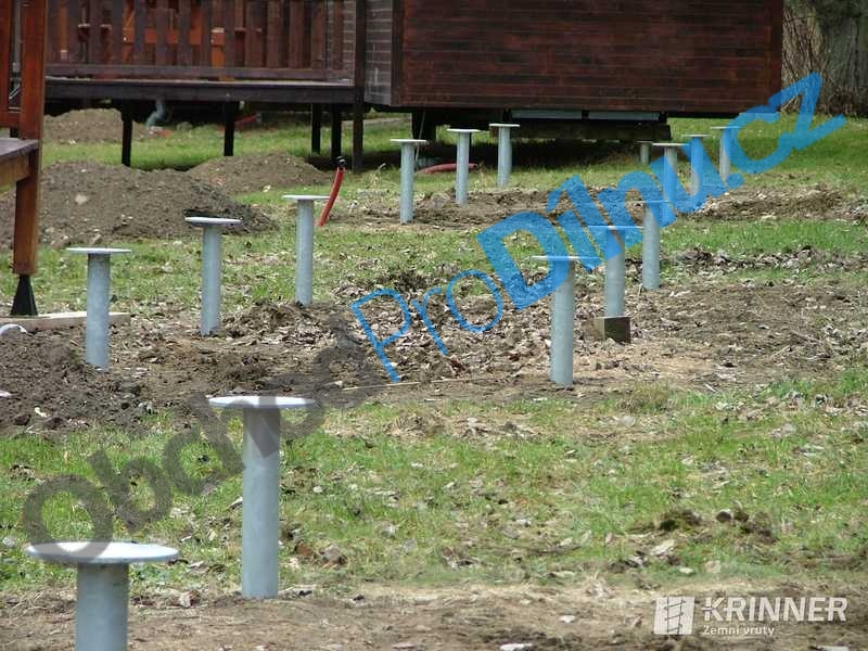 chatka na základech ze zemních vrutůpřipravené základy na chatkuhala na zemních vrutechcvičební odpaliště golfové na zemních vrutech