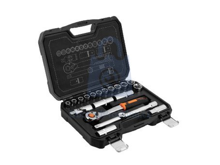 šestihranné nástrčné hlavice 1/2" 12 ks: 10, 11, 12, 13, 14, 15, 16, 17, 18, 19, 22, 24 mm, prodloužené šestihranné nástrčné hlavice 1/2" 2 ks: 17, 19 mm, ráčna 1/2", 92 zubů, prodlužovací nástavec 1/2" 250 mm, univerzální kloub 1/2", redukce 1/2" x 3/8", nástrčné hlavice na zapalovací svíčky 1/2" 2 ks, 16 mm a 21 mm.