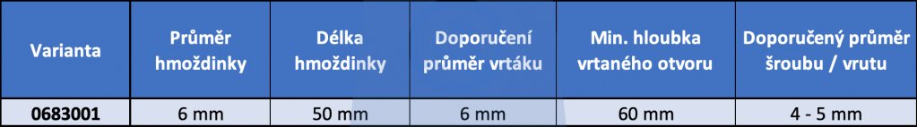 Základní technická data, aktuální ceny a dostupnosti naleznete výše. Na všech sloupcích v tabulce variant, které obsahují zelenou šipku, je možné technická data filtrovat. Usnadní Vám to vyhledání konkrétní varianty dle průměru, délky či jiného parametru. Rozpěrné hmoždinky můžete nakoupit v maloobchodním i velkoobchodním balení, u maloobchodního balení může být definováno minimální odběrné množství.
