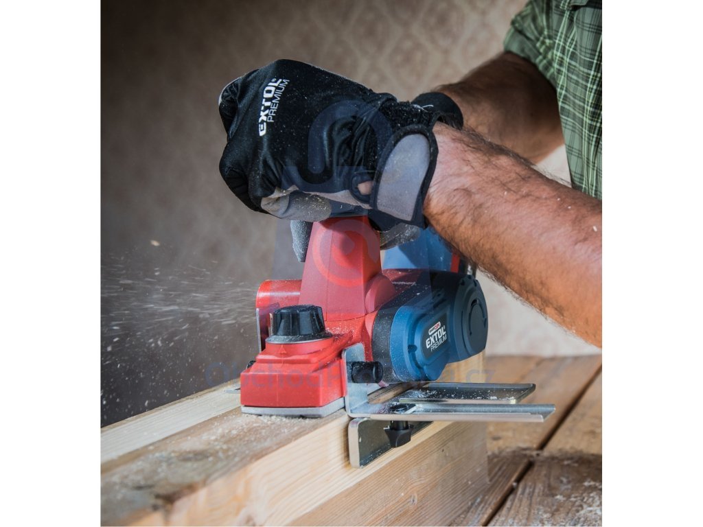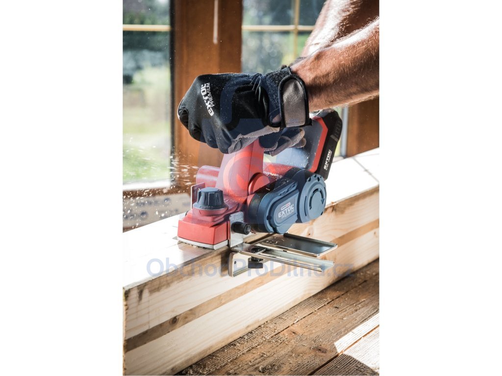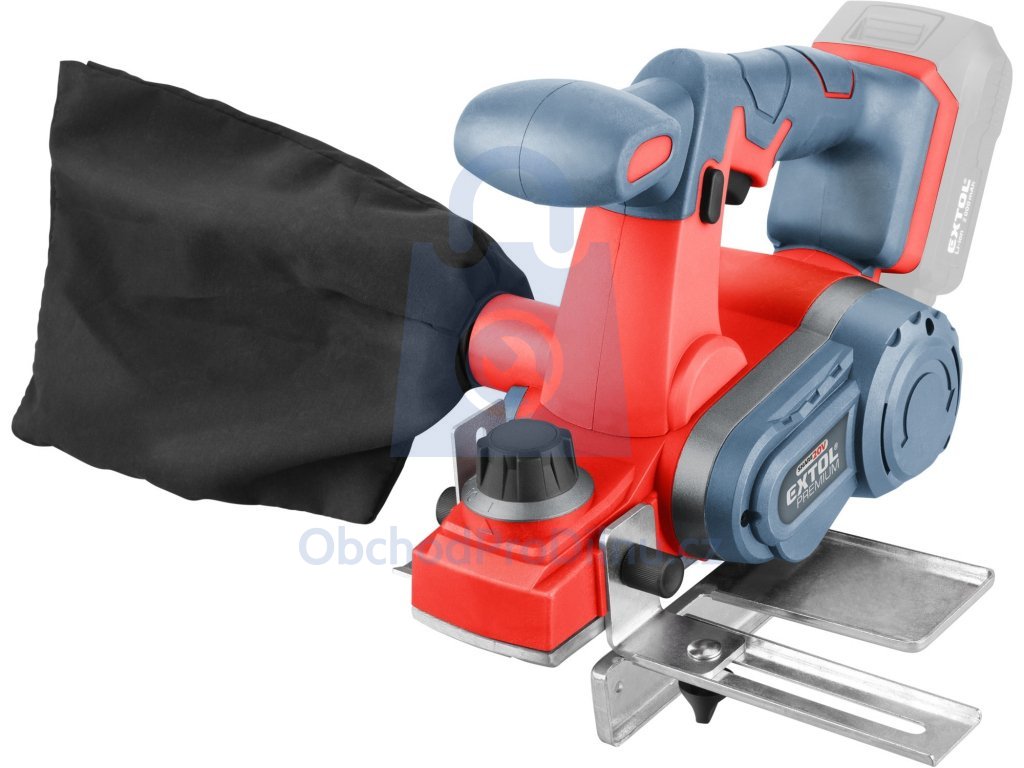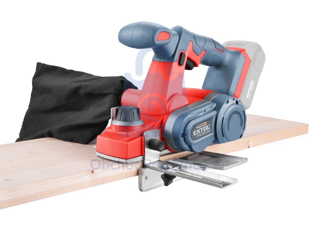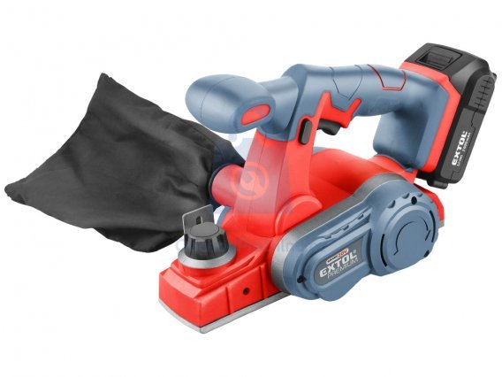 Aku hoblík kombinuje rychlost a výkonnost elektrického hoblíku s pohodlím akumulátorového nářadí. Aku hoblík umožňuje rychlé a přesné odebrání materiálu bez překážejícího kabelu. Řezná hlava hoblíku obsahuje dva kvalitní břity. Ochranný trn v pracovní desce hoblíku ochraňuje čepel i obráběný materiál, protože udržuje čepel zvednutou a mimo kontakt s povrchem materiálu mezi jednotlivými řezy. Sběrný vak připojený na prachový výstup pochytá prach, třísky a piliny a pomáhá tak udržovat pracovní prostor čistý. Přiložený adaptér pro falcování pomáhá vytvářet polodrážky v deskách a paralelní adaptér udržuje hoblík v nastavené vzdálenosti. Akumulátor lze použít ve všech typech nářadí řady EXTOL SHARE20V. Stroje lze zakoupit v sadě s akumulátorem nebo samostatně. Díky použité Li-ion technologii je možné akumulátor kdykoliv dobíjet, aniž by se tím snižovala jeho kapacita. Li-ion akumulátor ztrácí energii vlivem samovybíjení velmi pomalu a vydrží dlouho nabitý a připravený k použití.