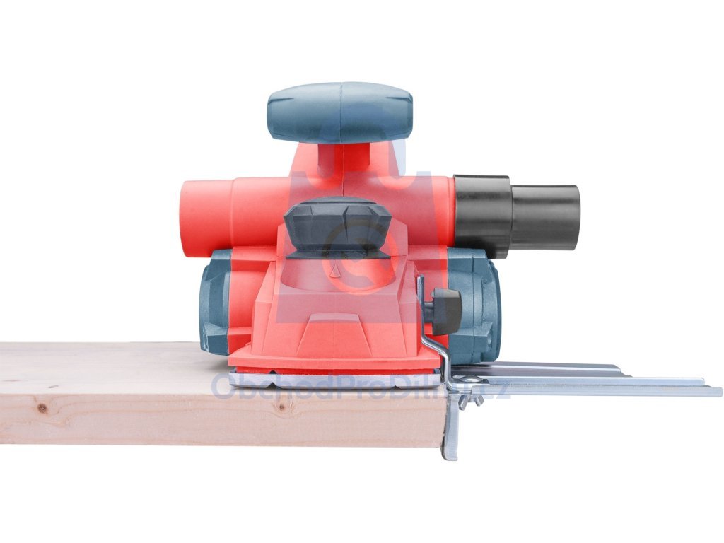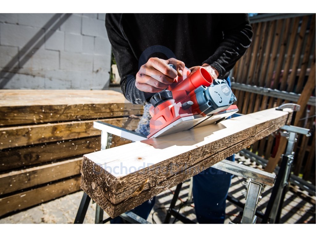 Velmi silný elektrický hoblík s hoblovací šířkou 110 mm a příkonem 1 000 W je vhodný k hoblování, srážení a drážkování dřeva (např. trámů a prken). Úběr je nastavitelný, můžete hoblovat do hloubky 0 - 3 mm při jednom protahu (hloubku úběru je možno nastavovat po 0,25 mm). Při hoblování polodrážek můžete využít rozsah 0 - 8 mm. Na hoblovací desce jsou dvě různě hluboké drážky, které slouží ke srážení hran, a sklopný ochranný trn, který chrání při přerušení práce nože a plochu pod hoblíkem proti poškození. Pokud máte raději práci bez ochranného trnu, můžete jej snadno zajistit v desce, aby se nevyklápěl. K hoblíku je možné připojit odsávání pilin a prachu z pravé nebo levé strany.