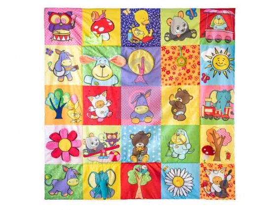 Prostorná hrací deka ve stylu patchwork nabízí mnoho hracích aktivit, které jsou zakomponovány do jednotlivých obrázků. Okvětní lístky, uši pejska, ocásek kočičky i zelený trs travičkyvydávají po promnutí zvuk šustícího papíru. Chobot slona a mochomůrka mají zabudované pískátko.