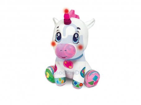 Plyšový interaktivní jednorožec je hebký mazlíček, který má 5 interaktivních tlačítek pro výuku prvních čísel, písmenek, tvarů a barev. Naučí dítě nová slovíčka díky kouzelným písničkám a veselým rýmovačkám. Interaktivní tlačítka jsou umístěna na tlapkách s obrázky, které po zmáčknutí reagují. Líčka a růžek jednorožce se rozsvítí. Hračka je bezpečná a vyrobená z netoxických látek a je důležitá pro psychomotorický, emoční a smyslový rozvoj dítěte. Jednorožec je opravdu všestranný.