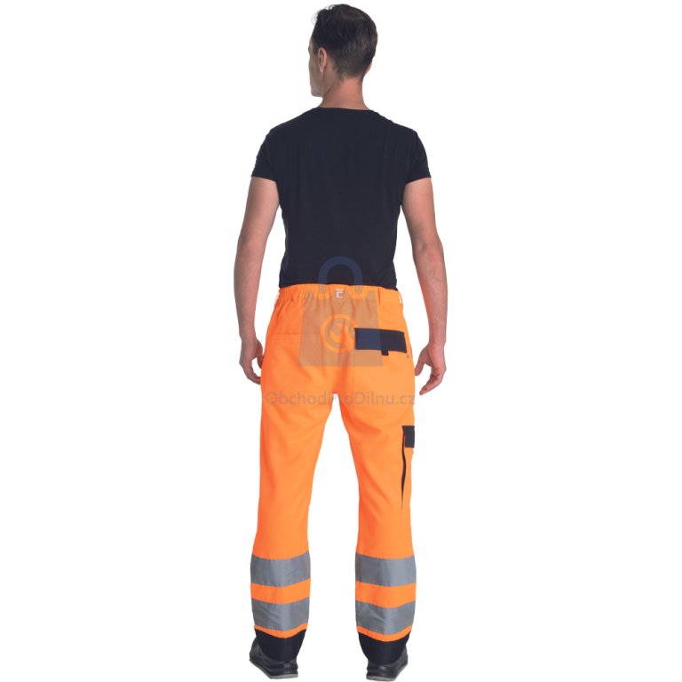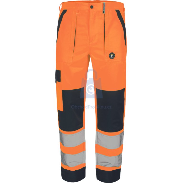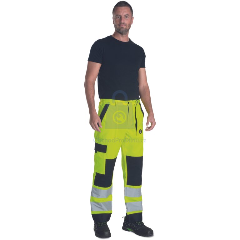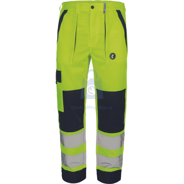 Kalhoty mají elastický pas, nastavitelnou délku nohavic až o 5 cm a zesílenou oblast kolen, která zajišťuje vyšší odolnost při práci v kleče. Disponují 2 předními kapsami, 1 stehenní kapsou a 2 zadními kapsami se zapínáním na suchý zip. Pro zvýšení viditelnosti jsou na spodních částech nohavic 2 šité reflexní pruhy o šířce 7,5 cm. Kalhoty jsou certifikovány dle normy EN ISO 20471 (Class 2) a hodí se zejména pro práci ve strojírenství nebo stavebnictví. Pro firmy nabízíme výhodnější ceny při větších odběrech pracovního oblečení – kontaktujte nás na velkoobchod@obchodprodilnu.cz.
