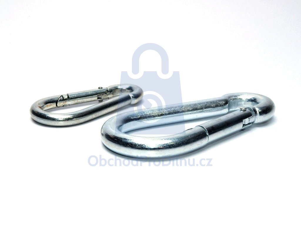 Karabina je bez pojistky. Kvalitní karabina je ocelová s povrchovou úpravou bílý zinek.