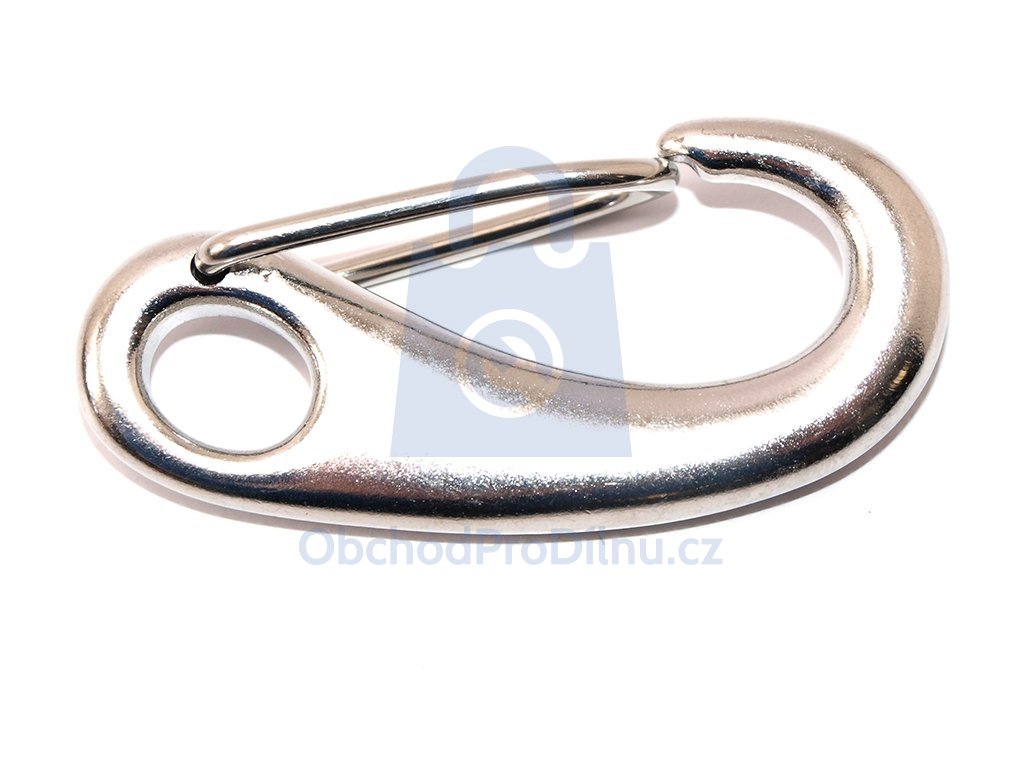 Karabina oválná s okem je vyrobena z nerezavějící oceli A4, která dobře odolává korozi díky použití přísad molybdenu při výrobě. Karabinu můžete využít i v náročných podmínkách. Disponuje drátěnou pojistkou proti vyhaknutí. Univerzální oválná karabina je vhodná pro vodítka, na klíčenky, textilní či kožené popruhy.