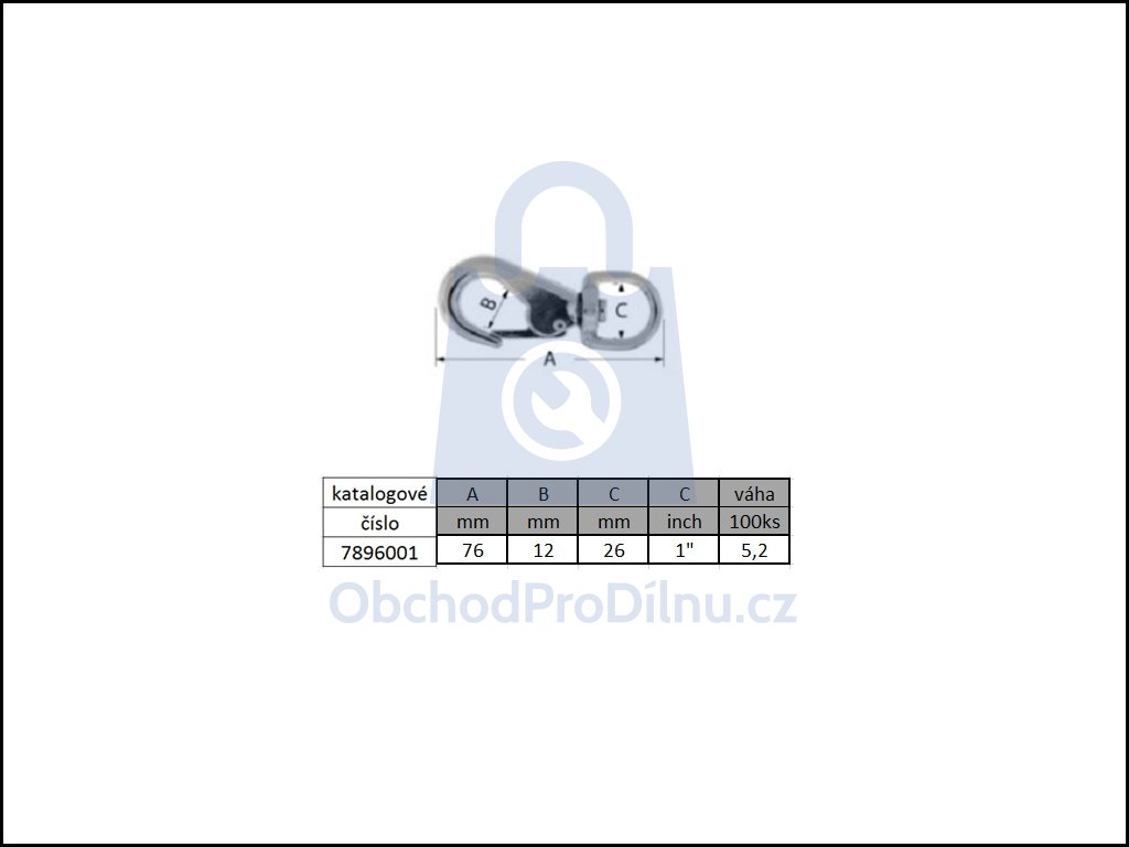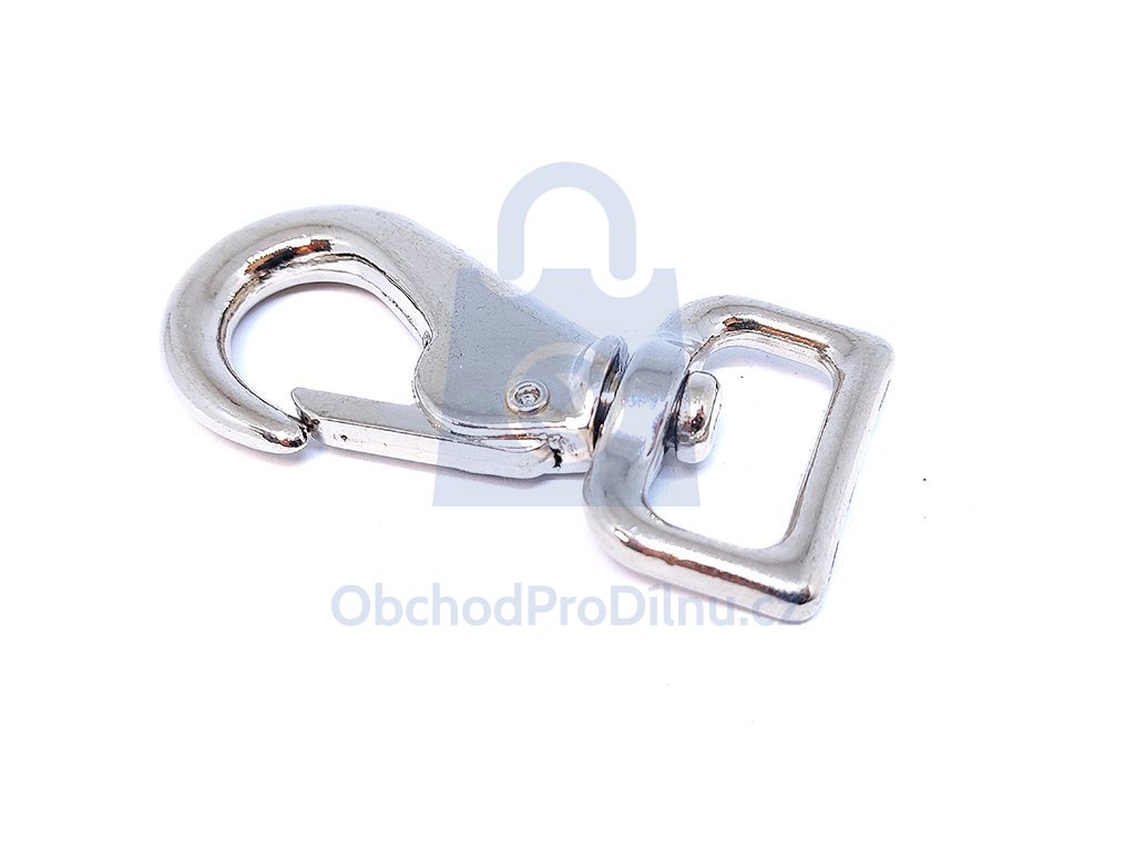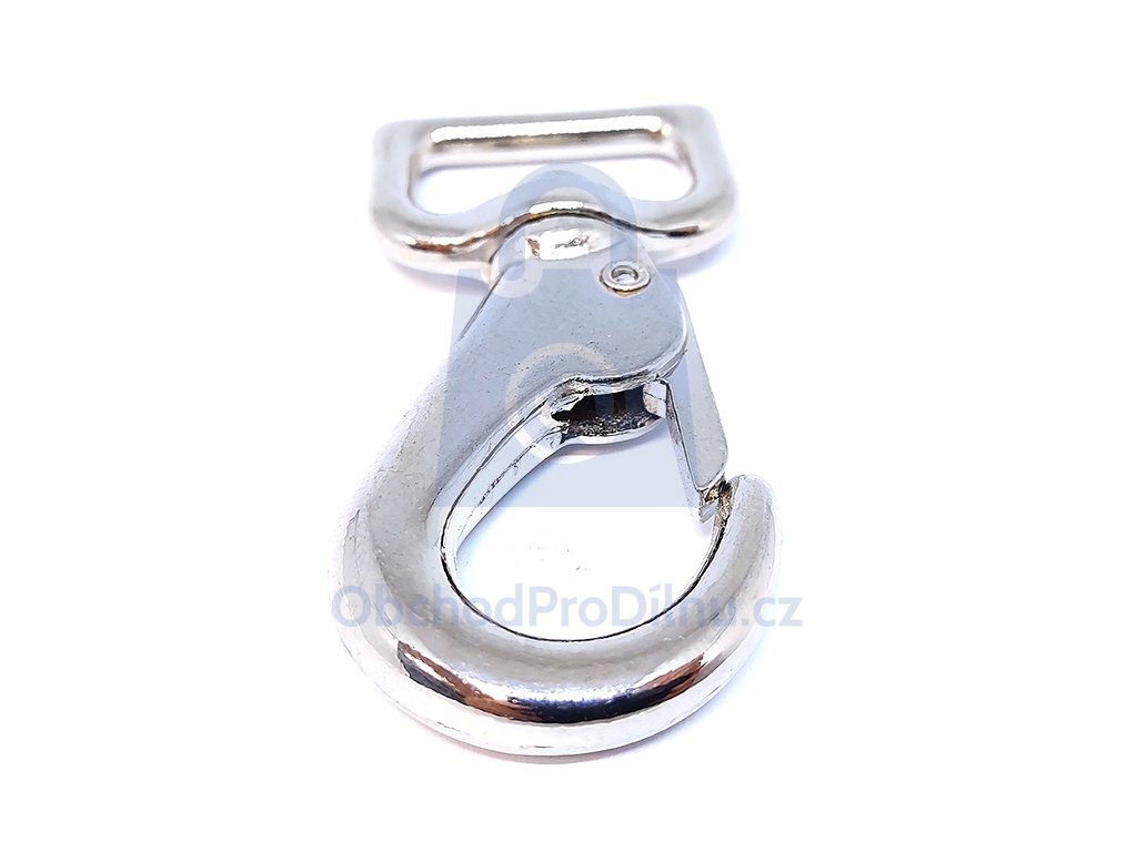Karabina univerzální popruhová, poniklovaná. Karabina s otočným okem se vyrábí z poniklované zinkové slitiny Zamak2 (ZnAl4Cu3) a má otočné oko ve tvaru písmene D. Je určena především pro popruhy. Součástí karabiny je jednoduchá západka pro snadnou obsluhu, která brání nechtěnému uvolnění karabiny. Tyto popruhové karabiny nabízíme po jednotlivých kusech nebo jako cenově výhodnější balení po 20 kusech.