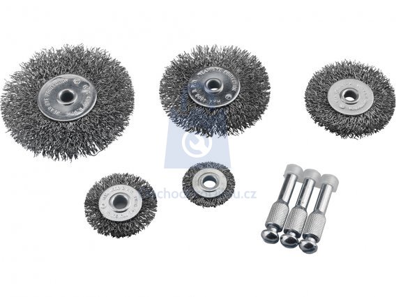 Sada brusných kartáč se stopkovým upínáním o průměru 6 mm. Kartáč nabízíme ve variantě s ocelovými dráty. Používá se na především na broušení povrchů před aplikací nátěrů a laků. Využijete ho pří čištění povrchů materiálů od nečistot nebo rzi. Oproti brusným papírům se drátky dostanou i do hůře přístupných míst a rychleji odstraňují staré povrchové úpravy. Je vhodný i na zdrsnění a odjehlování. Kartáč je v chromovém barevném provedení. Sada obsahuje 5 dílů.