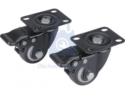 Otočná kolečka s obručí z PVC a brzdou o průměru 40 mm mají ložiska a kovovou montážní základnu. Maximální nosnost je 30 kg (1 kolečko). Kolečka jsou dodávána v balení po 2 kusech.
