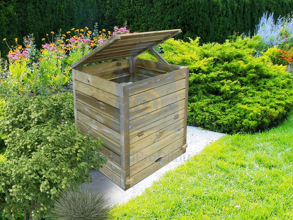 Dřevěný komposter. Dřevo je ošetřeno tlakovou impregnací proti plísní, přesto ho doporučujeme ošetřit vhodnou povrchovou úpravou pro venkovní dřevo (podle vlastní volby) - tzn. protiplísňový nátěr plus např. lazura.