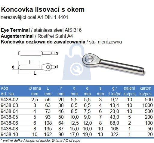 Koncovka lisovací s okem je vyrobena z nerezavějící oceli A4. Z důvodu použití přísad molybdenu zaručuje lepší odolnost proti korozi, a díky tomu je vhodné koncovku s okem použít i v náročných podmínkách. Nerezová koncovka slouží jako koncový prvek zalisovaný na laně, pomocí kterého je možné lano uchytit.