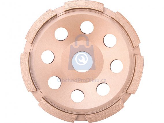 Diamantový brusný kotouč je vyrobený z oceli a opatřený diamantovou vrstvou. Určený pro profesionální a poloprofesionální použití. Používá se při úpravě betonu, obkladů, dlažeb a ostatních stavebních materiálů. Brusný kotouč má jednu řadu diamantových segmentů, které zajišťují chlazení kotouče a průběžně odvádí odebíraný materiál. Robustní talíř kotouče je vyroben z kvalitní slitiny. Hodí se pro suché i mokré broušení.