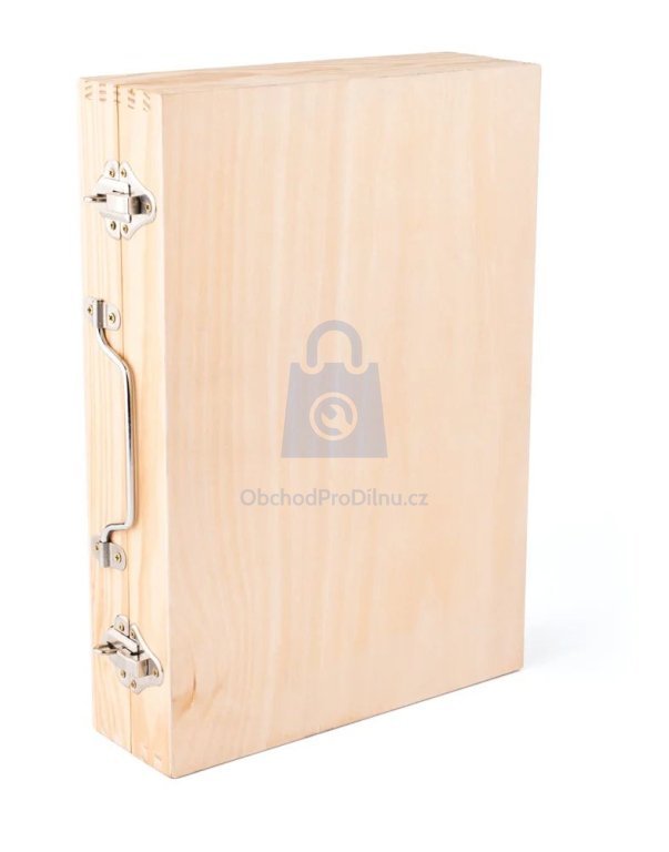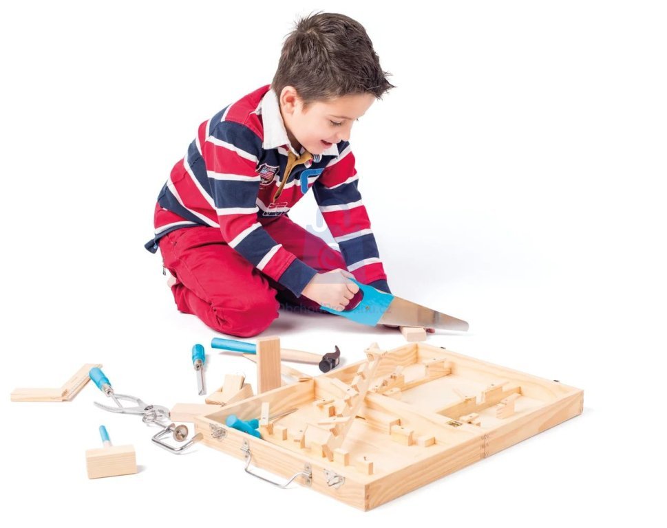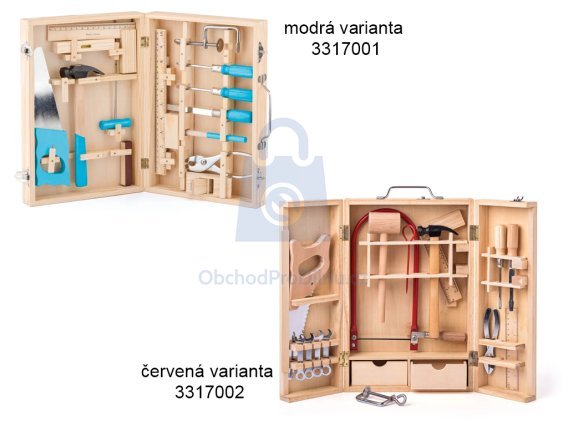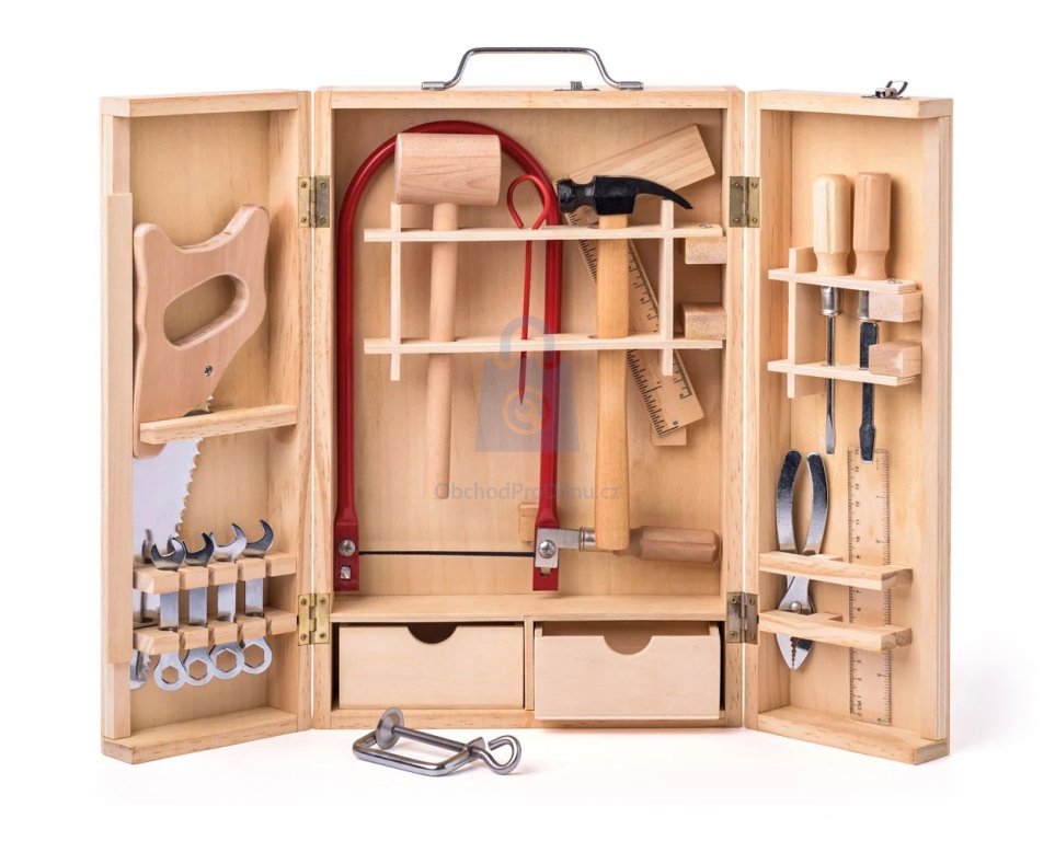 Dětské nářadí vyrobené z kombinace kovu a poctivého dřeva patří mezi kvalitní dětské hračky. Malí kutilové v kufříku naleznou autentické napodobeniny nářadí nezbytného pro domácí opravy, jako je pilka, kladívko, šroubováky, vodováha, kleště a další. Dřevěný kufřík je opatřen kovovými přezkami a uchem pro snadné přenášení. Uvnitř má každé nářadí své místo se západkami, které ho zajišťují proti vypadávání při přenášení kufříku. Nářadí je vzhledem k reálnému provedení vhodné pro všechny kutily od 5 let.