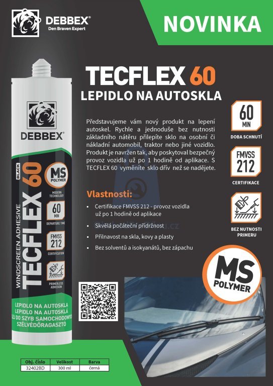 Lepidlo na autoskla TECFLEX 60 – Den Braven je vysoce kvalitní, rychle vytvrzující a flexibilní lepidlo na čelní skla vozidel. Na bázi silyl-modifikovaného polymeru (MS Polymer), bez obsahu solventů a isokyanátů, bez zápachu a bez nutnosti použití základního nátěru (Primeru). Certifikace FMVSS 212 umožňuje bezpečný provoz vozidla již po 60 minutách od aplikace.