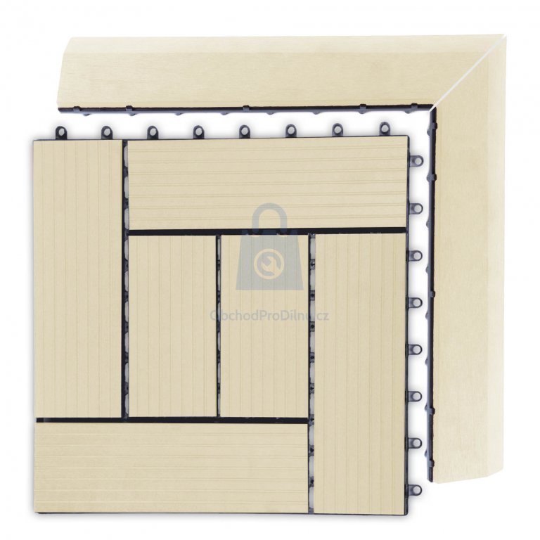 Na vytvoření ostrého rohu potřebujete 1x levou a 1x pravou lištu. Po obvodu terasy budete potřebovat jednu rovnou lištu na jednu obvodovou dlaždici.