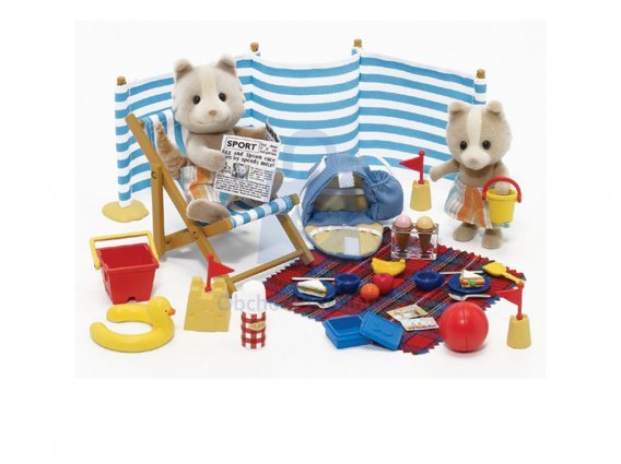 Všechna zvířátka milují moře a na pláži je tolik zábavy! Už stačí jen postavit hrad z písku, tatínek si ve svém lehátku přečte noviny a plachta je ochrání před větrem. Malý medvídek si lebedí v písku obklopem svými oblíbenými hračkami. Obě postavičky jsou oblečeny ve slušivých plavkách. Na piknikové dece už leží ovoce, toasty, talířky, příbory, a v termosce je pro osvěžení ledová voda. Lehátko je skládací. Hrníčky, kyblíky a lopatka jsou uloženy společně s balónkem a kruhem do vody vedle tašky. Zástěna proti větru je rozkládácí v kombinaci plast a látka. V chladící tašce jsou zabaleny jen samé dobroty! Pro čtení jsou přiloženy opravdové papírové noviny s informacemi ze sportu a 2 mini pohlednice.