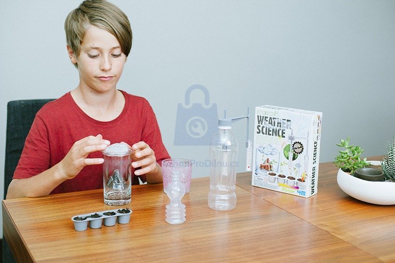 Kreativní sada „Meteorologická stanice“ od značky 4M umožňuje dětem prozkoumávat různé meteorologické jevy – experimentovat se statickou elektřinou, která simuluje blesky; vytvořit „mraky v dlani“; sledovat vzdušné proudy generující vítr; a studovat skleníkový efekt či kyselý déšť. Sada je určena pro děti od 8 let a nevyužívá baterie. Obsahuje různé komponenty a experimentální prvky pro praktické učení o počasí a jeho změnách. Vyrobeno značkou 4M.