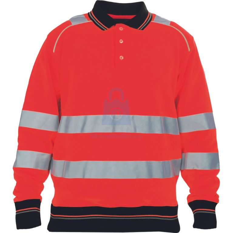 Mikina má límec a propínací légu na 3 knoflíky, což jí dodává vzhled polokošile. Reflexní pruhy jsou vedeny po obvodu pasu, rukávů a přes ramena, a doplňuje je dekorativní prošití v HI-VIS barvě. Kontrastní proužky v nápletech zvyšují nejen styl, ale i viditelnost. Oděv splňuje požadavky EN ISO 20471 (třída 3).