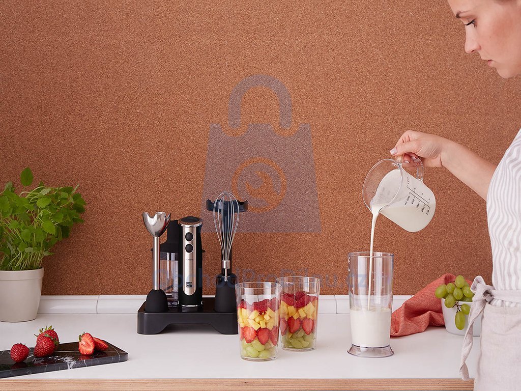Součástí mixéru je nerezový nástavec 3D Quattro blade, nerezová metlička, nástavec na výrobu pyré, nádoba na sekání, nádoba na mixování a šlehání a stojan. Příslušenství k mixérů můžete mýt v myčce.
