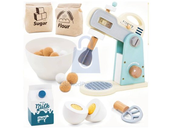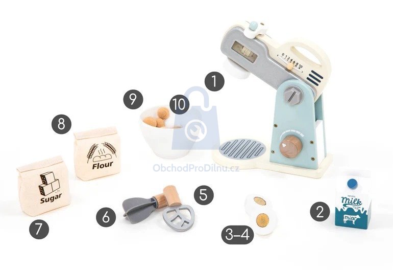 - Složení sady: mixér, mísa, mouka, cukr, vejce, mléko, plyšové kuličky, 2 míchací nástavce, šroubky
