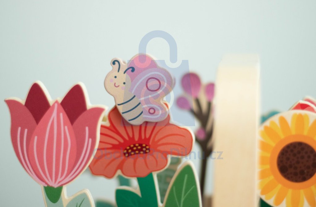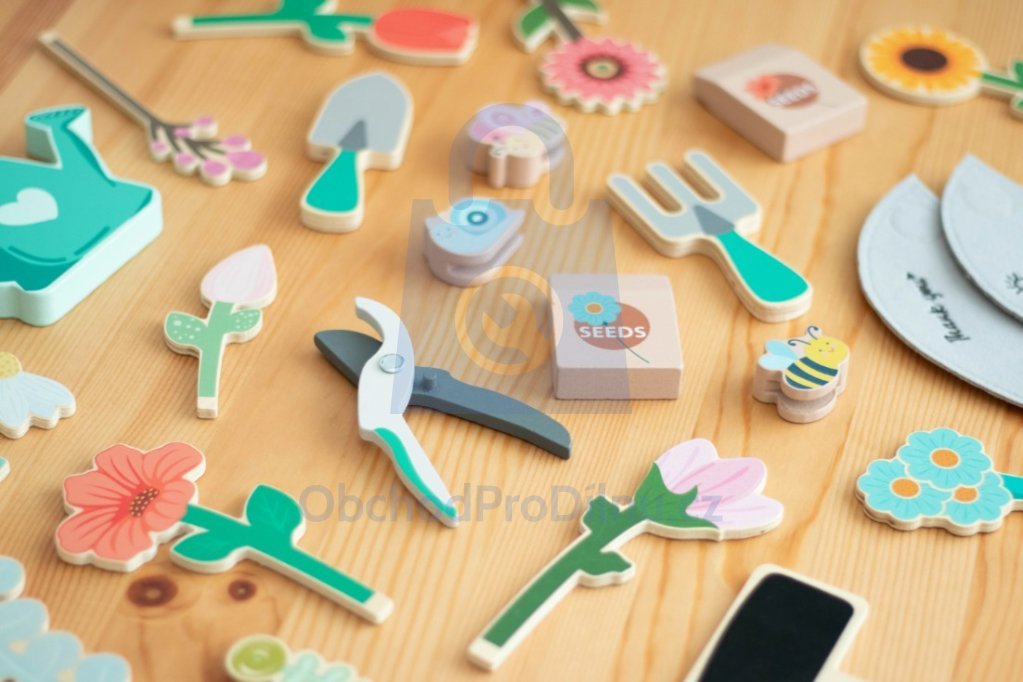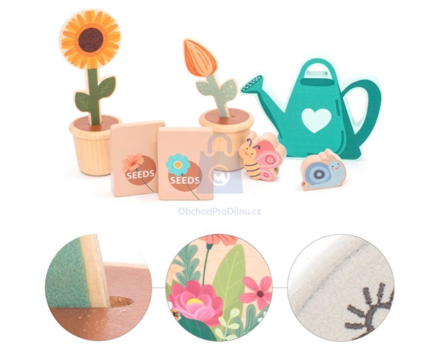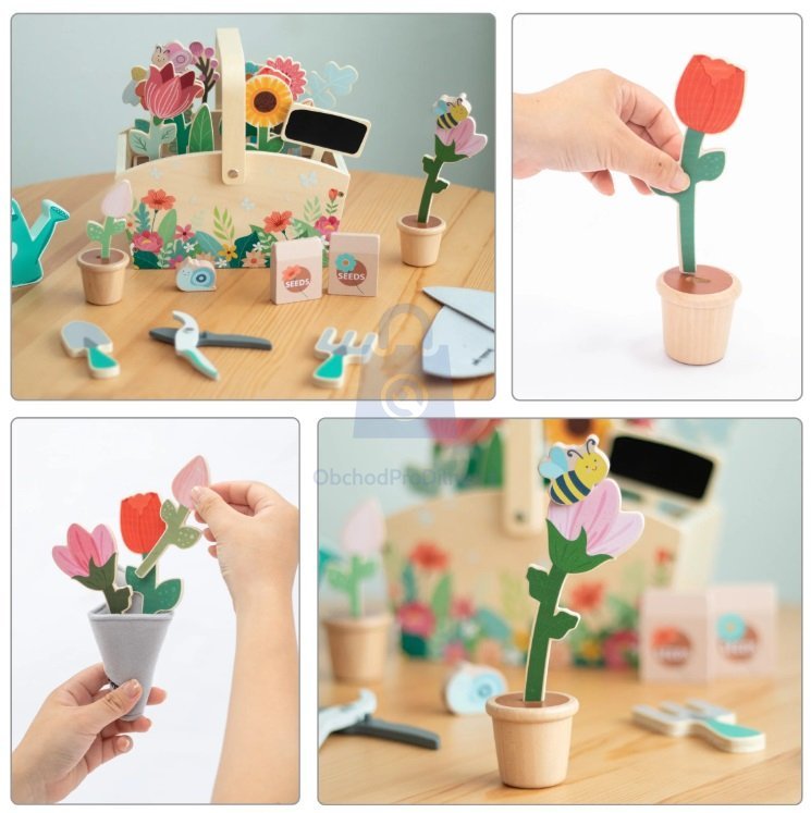 Se zahradnickou sadou UMU Toys si děti založí svoji zahrádku a vypěstují si nejrůznější rostliny, a to již od semínek. Sada je vyrobená ze dřeva a obsahuje dřevěný přenosný košík, dřevěnou destičku - hlínu, dětské zahradní nářadí, konvičku na zalévání, květináč, motýla a včelku, semena žlutých a modrých květin, poupata tulipánů a spoustu druhů rozkvetlých rostlin: tulipány, slunečnici, japonskou sakuru, gerberu, lilii, eukalyptus apod. V sadě se celkem nachází 30 dílů.
