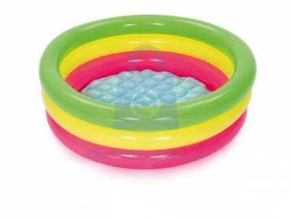 Nafukovací dětský bazének s nafukovací podlahou má 3 prstence v růžovo-žluto-zelených barvách. Nafukovací podlaha přináší nejen pohodlí, ale také bezpečí při případném pádu dítěte. Nafukovací prstence jsou pevné a mohou sloužit i jako opěra pro děti. Bazén je určený pro děti od 2 let a jeho nafouknutí je velmi jednoduché. Rozměry bazénku jsou 70 x 24 cm. Celkem se do bazénku vejde okolo 41 litrů vody. Při koupání by měla být přítomna dospělá osoba.