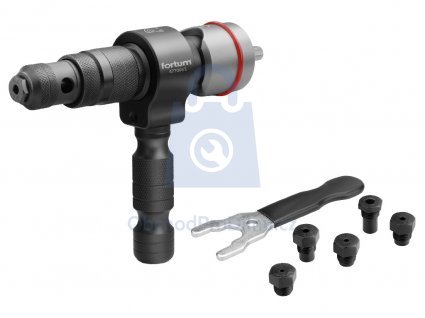 Profesionální nýtovací adaptér Fortum je určen k usazování trhacích nýtů s průměrem těla 2,4; 3,2; 4,0; 4,8; 6,0; 6,4 mm z hliníku,oceli a nerezové oceli pro vytvoření pevného nezávitového spoje materiálů. Lze upnout do sklíčidlové hlavy aku vrtačky, elektrické nebo pneumatické vrtačky. Malý a kompaktní skelet společně se zesíleným vnitřním mechanismem a T-rukojetí dovolují vyvinout extrémní síly potřebné pro práci s největšími a nejtvrdšími trhacími nýty. K práci je možno použít elektrické nebo aku nářadí s min. požadovaným kroutícím momentem v rozmezí od 2 Nm do 22 Nm (dle velikosti a materiálu použitého nýtu). Adaptér nelze používat s jakýmkoliv typem rázového (impact) elektrického, aku nebo pneumatického nářadí a také nesmí být používán společně s funkcí příklepu.