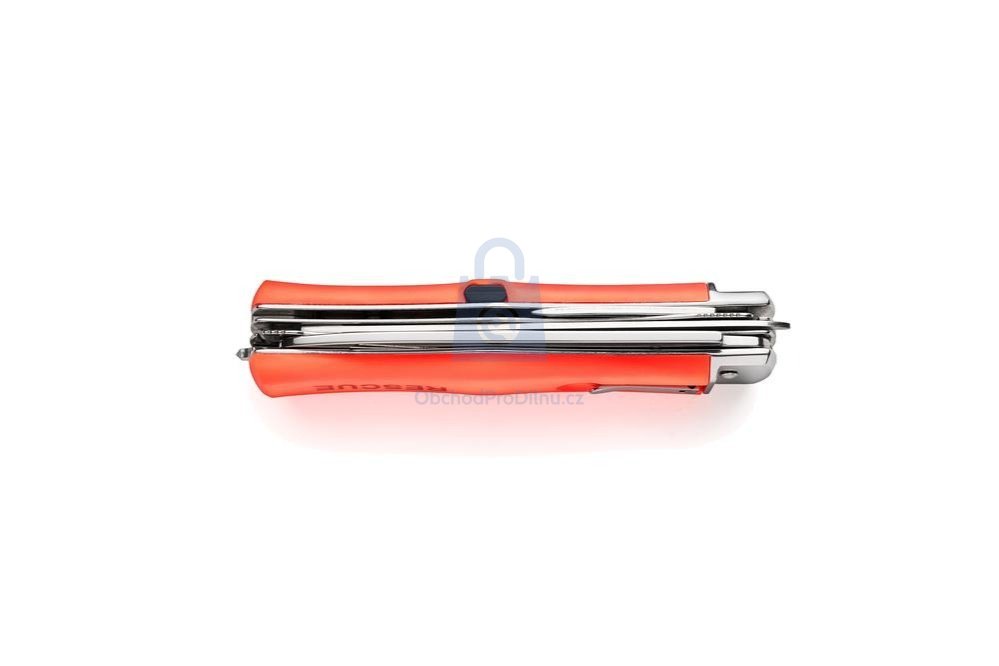 automatický záchranářský nůž s pilovým ostřím, LED signalizací, rozbíječem skla a šroubováky