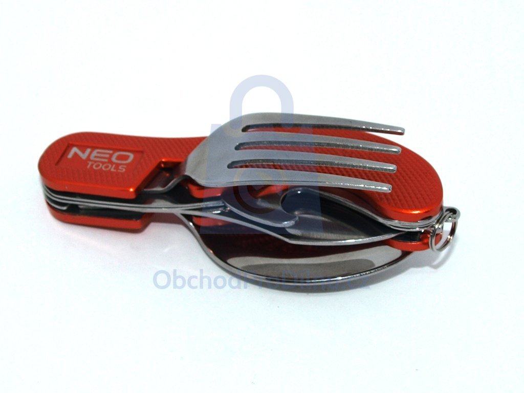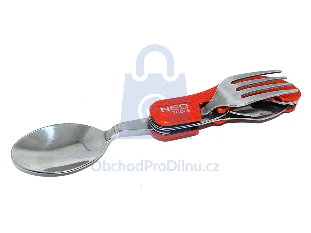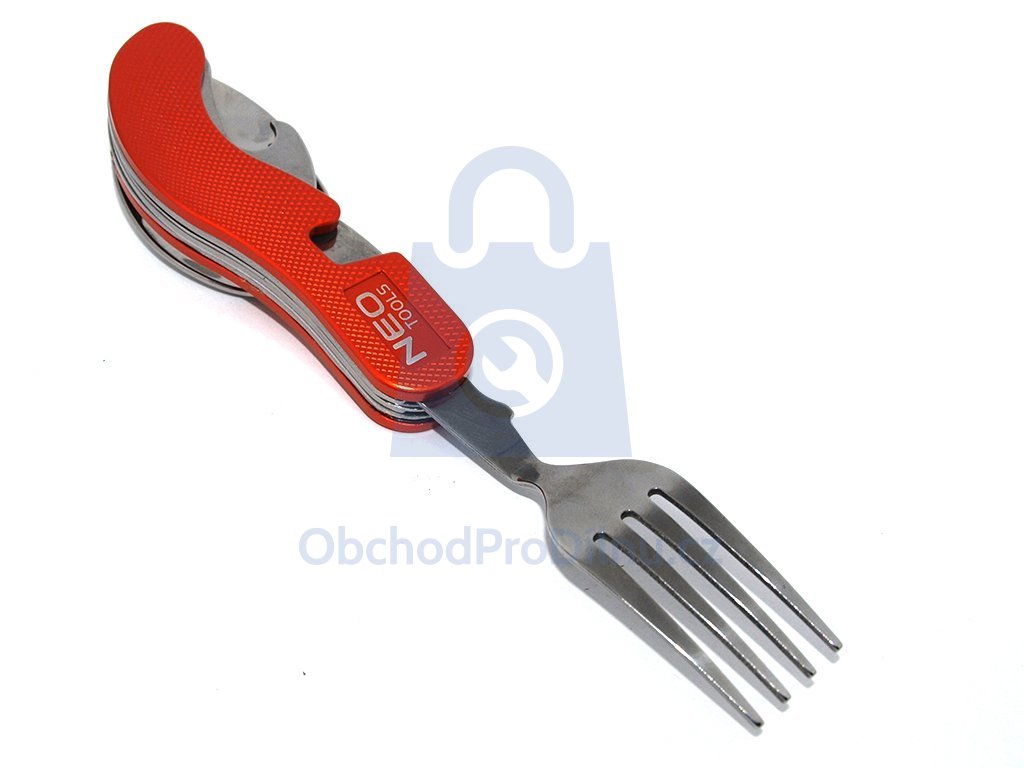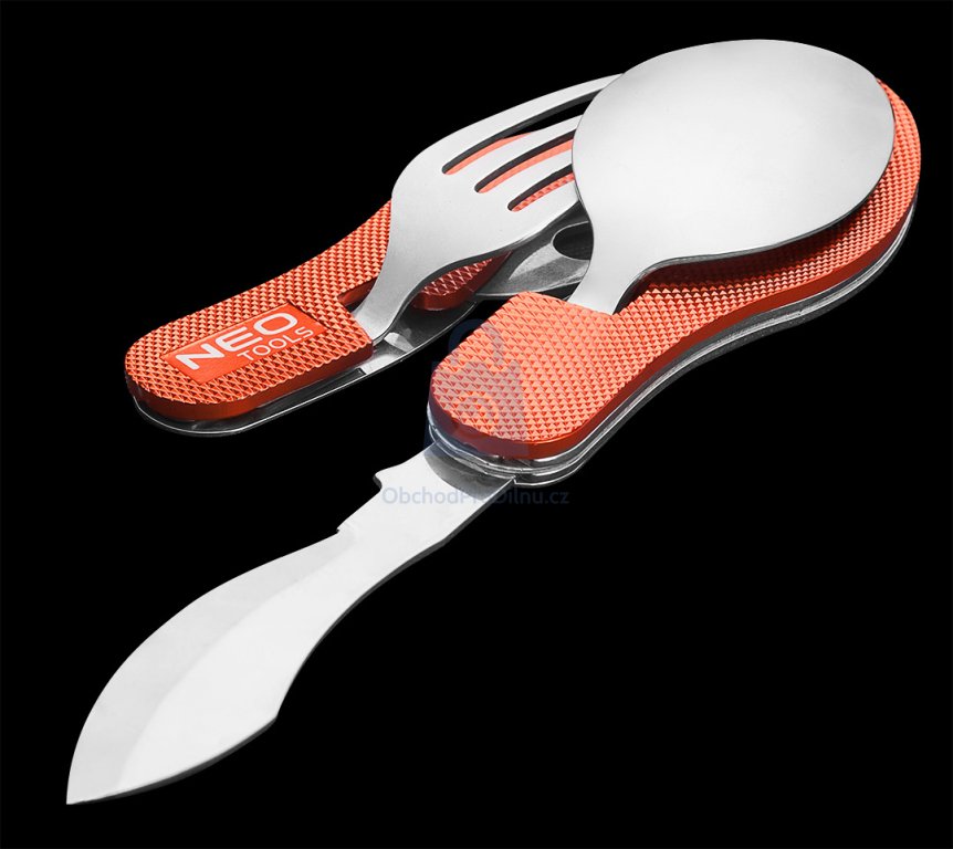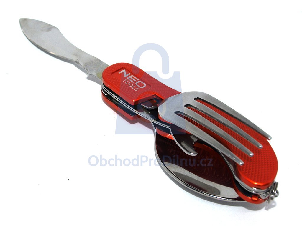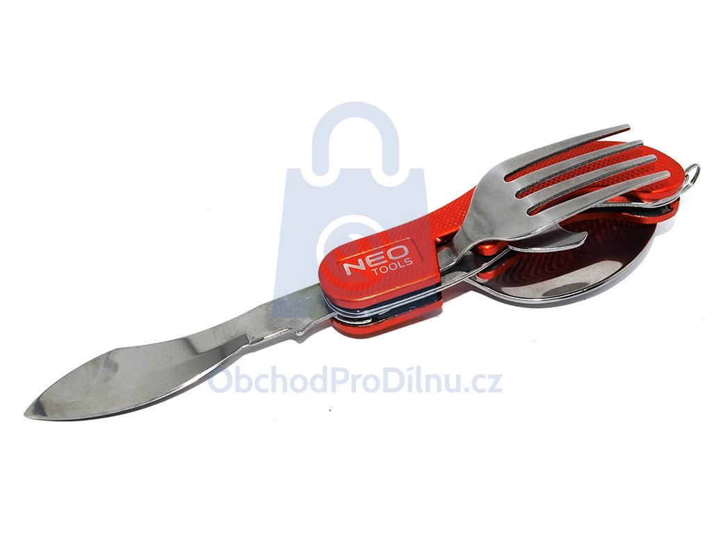 Kapesní nůž pro kempování od výrobce NEO tools bude vhodným multifunkčním nástrojem pro Vaše cestování. Tento skládací příbor Vám ušetří místo svojí skladností i rozměry. Jeho váha je pouhých 0.22 kg. Tento multifunkční nástroj je vyroben z kvalitní odolné oceli, která zajišťuje jeho dlouhou životnost. Kapesní nůž se skládá také z vidličky, lžíce a otvíráku. Tento nůž bude Vaším vhodným společníkem při výletu do přírody, k moři nebo při kempování. Pevné černé pouzdro poslouží pro snadnější přepravu a skladování.