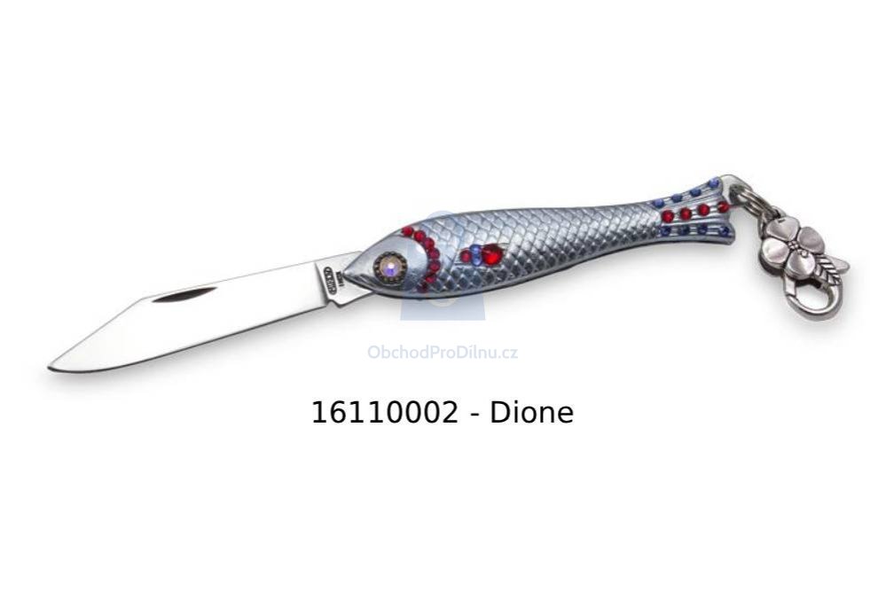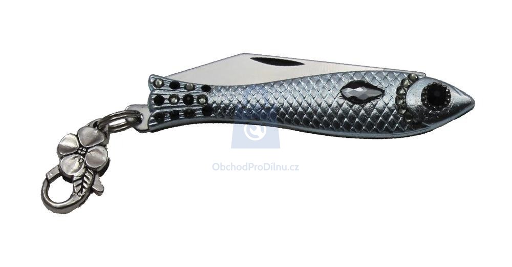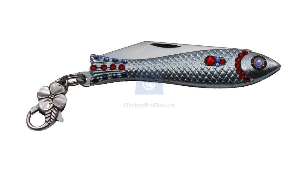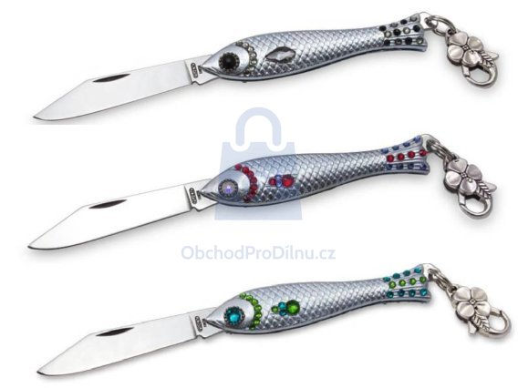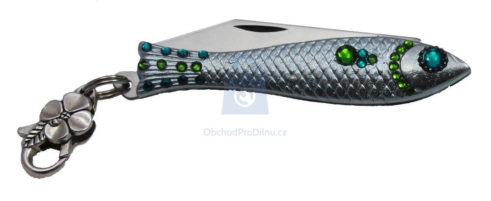 Výrobce: Mikov Mikulášovice. Ručně zdobené kapesní nože Rybička s kamínky Preciosa – elegantní český dárkový výrobek v plechové krabičce s karabinkou.