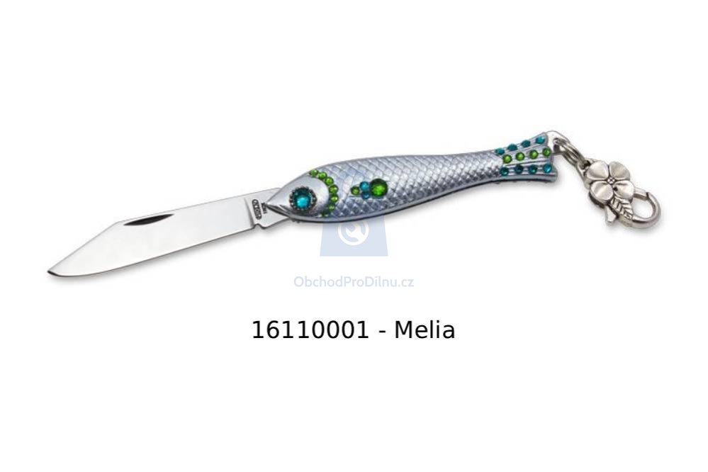Kapesní nůž Rybička s kamínky 130-NZn-1 od českého výrobce Mikov Mikulášovice je elegantní dekorativní verze legendárního nože Rybička. Každý kus je ručně zdobený originálními kamínky Preciosa, díky čemuž se stává jedinečným dárkem i sběratelským předmětem. Čepel je vyrobena z nerezové oceli 420 o tvrdosti 52–55 HRc a střenky ze zinkové slitiny. Nůž je uložen v plechové dárkové krabičce a doplněn ozdobnou karabinkou. Ruční zpracování i detailní zdobení činí z každého kusu originál určený do kolekce dekorativních výrobků Mikov.