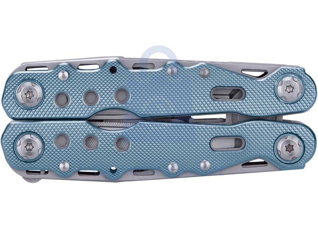 Multifunkční nůž/kleště s 9 díly: kleště, pilník + 5.5 mm plochý šroubovák, pilka, střenka nože, malý nožový bodec, šroubováky PH1 + plochý 3 mm a 4 mm, dva otvíráky (na konzervy+na láhve). Vyrobeno z nerezové oceli.