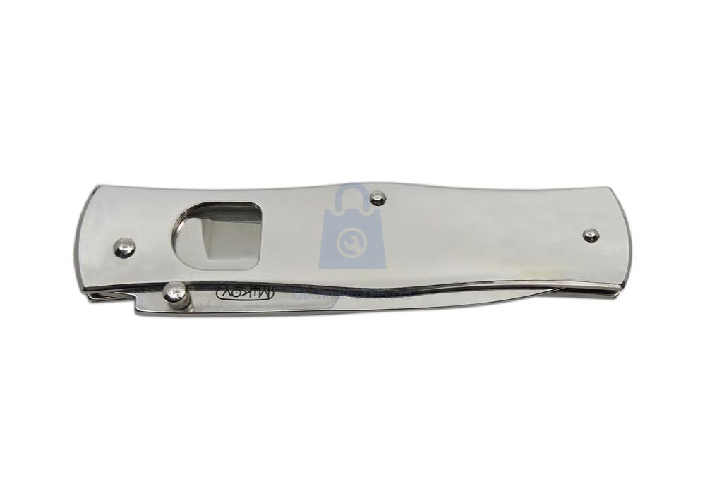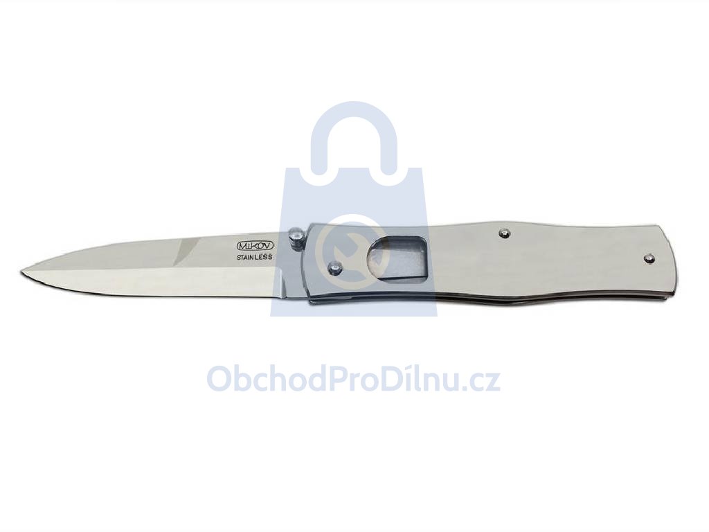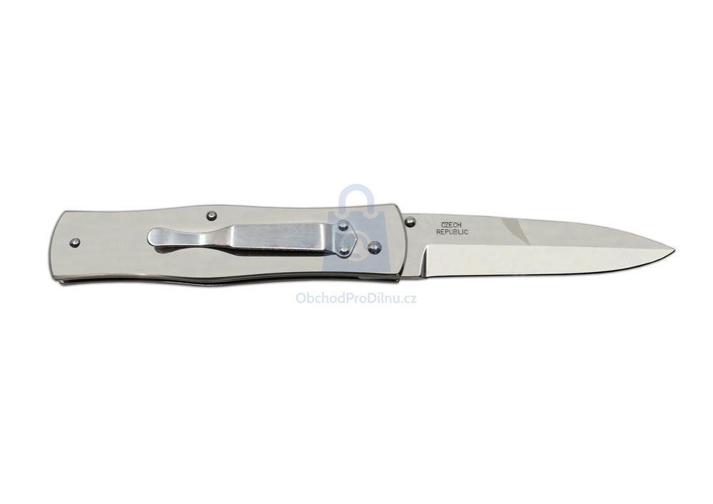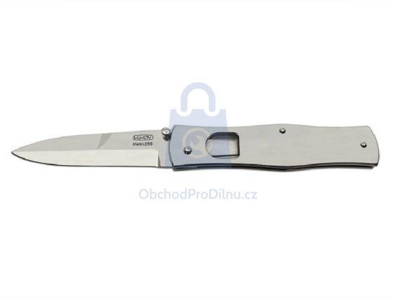 Výrobce: Mikov Mikulášovice. Elegantní celonerezový skládací nůž s pojistkou linerlock a klipem, vhodný pro každodenní i profesionální použití.