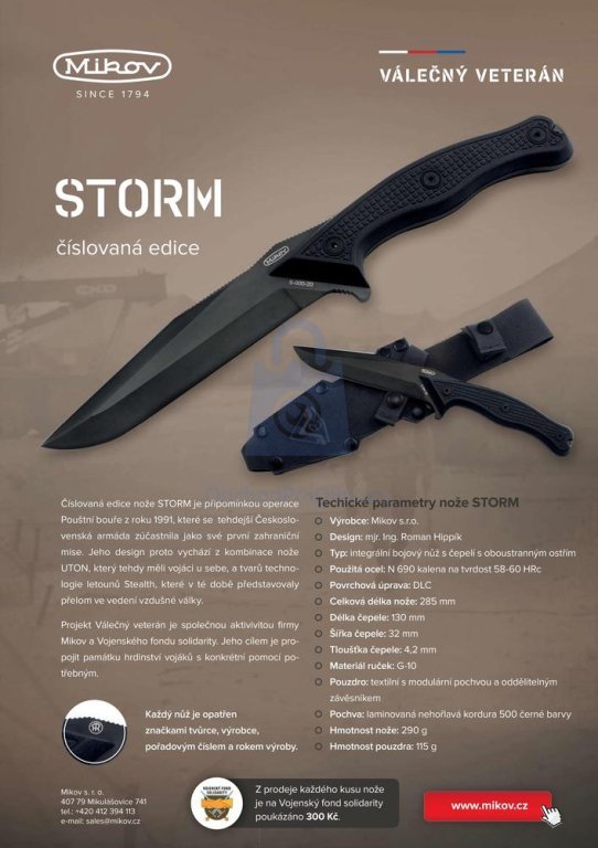 Vojenský nůž STORM od české nožířské firmy Mikov Mikulášovice je číslovaná edice věnovaná operaci Pouštní bouře (1991), které se účastnila tehdejší Československá armáda. Design nože kombinuje prvky legendárního nože UTON a moderní estetiku inspirovanou technologií letounů Stealth. Nůž vznikl v rámci projektu Válečný veterán ve spolupráci s Vojenským fondem solidarity – z každého prodaného kusu je věnováno 300 Kč na podporu vojáků a jejich rodin. Konstrukčně se jedná o integrální bojový nůž s čepelí z oceli Böhler N690 o tvrdosti 57–60 HRc, opatřenou povrchovou úpravou DLC. Rukojeť s příložkami z materiálu G10 je ergonomicky tvarována pro jistý úchop, včetně otvoru pro pojistnou šňůru. Součástí je modulární textilní pouzdro z kordury 500 s možností upevnění na opasek nebo MOLLE vazbu.